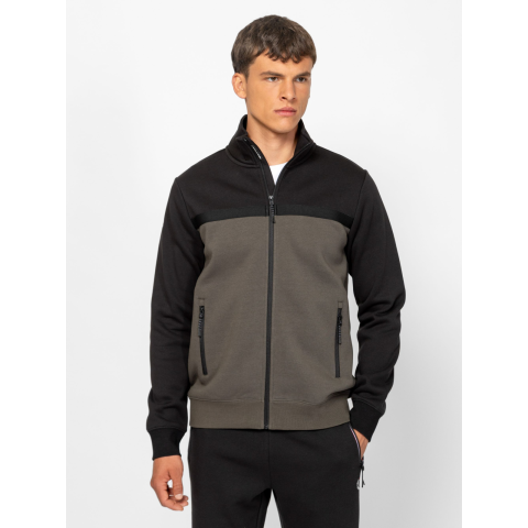Férfi cipzáros, állógalléros pulóver, sportos szabással, bordás passzés kézelővel és aljjal, cipzáros zsebekkel, kis nyomott márkajelzéssel az elején és a hátán. Anyaga: 80% pamut, 20% poliészter, belül bolyhozott fleece. A modell 188 cm magas és L-es méretet visel. T05029W2502