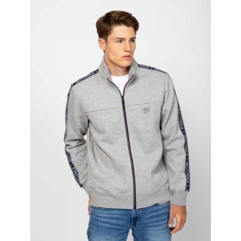 Férfi cipzáros, állógalléros pulóver, sportos szabással, bordás passzés kézelővel és aljjal, szabásvonalba helyezett zsebbel, kis nyomott márkajelzéssel az elején, logózott dekor szalaggal a vállán és az ujján. Viseld hozzá ZAROW25 melegítőnadrágunkat az új kollekcióból. Anyaga: 80% pamut, 20% poliészter, belül bolyhozott fleece. A modell 188 cm magas és L-es méretet visel. T05036W2503