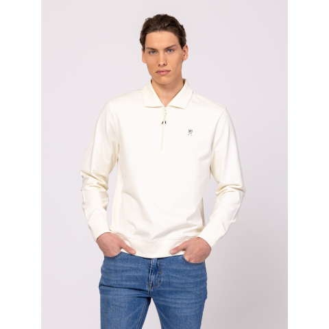 Heavy Tools Férfi Pulóver Timro T05018S2501. Színe: bone Férfi bebújós, cipzáros, állógalléros pulóver, klasszikus szabással, bordás passzés gallérral, kézelővel és aljjal, tiszta pamut anyagból, elején kis 3D márkajelzéssel, gallétján és alja passzéján dekor szalaggal. Anyaga: 100% pamut, french terry. A modell 188 cm magas, és L-es méretet visel. T05018S2501