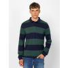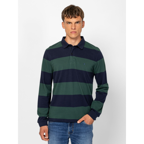 Férfi hosszú ujjú, galléros póló, trendi csíkozással és egyszínű sötétkékben, elegáns galléros-gombos nyakmegoldással, passzés kézelővel, tiszta pamut anyagból, elején kis szövött márkajelzéssel, oldalán szövött címkével. Anyaga: 100% pamut, piké. A modell 188 cm magas és L-es méretet visel. T22006W2501