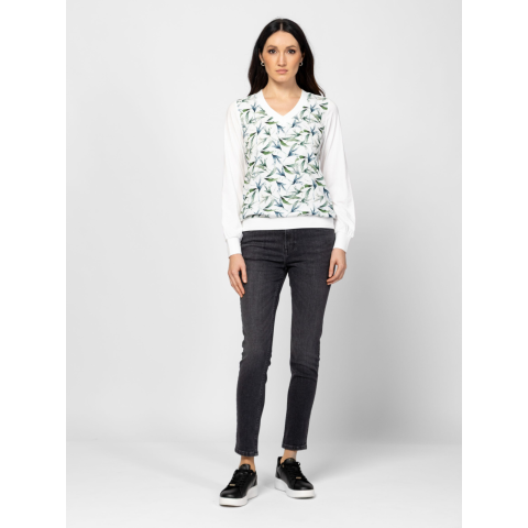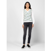 Női hosszú ujjú póló, bővebb szabással, bordás, passzés aljjal, kézelővel és v-nyakkal, dekoratív mintákkal, háta és ujja pamut keverék anyagból, eleje lágy esésű poliészter selyemből, kis fém márkajelzéssel a hátán. Anyaga: eleje: 100% poliészter, ujja és hát: 50% pamut, 50% modal, single jersey. A modell 175 cm magas és S-es méretet visel.  T15033W2503