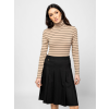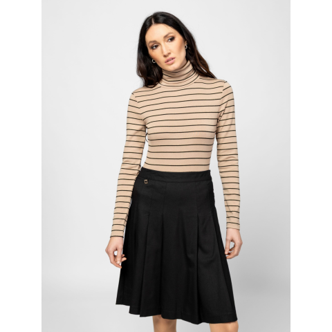Női hosszú ujjú garbó, enyhén karcsúsított szabással, csíkozásba beleszövött lurex szállal, elasztánnal és modállal kevert pamut anyagból, hátán kis nyomott márkajelzéssel, oldalában szövött címkével. Anyaga: 57% pamut, 38% modál, 3% elasztán, 2% fémszál. A modell 175 cm magas és S-es méretet visel.  T15041W2501