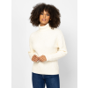 Női kötött, garbó nyakú pulóver, bővebb szabással, ejtett vállal, elején és ujján csavart mintával, kis műanyag márkajelzéssel az eleje alján. Anyaga: 49% viszkóz, 28% poliészter, 23% nylon, kötött anyag. A modell 175 cm magas és S-es méretet visel. T53033W2503