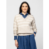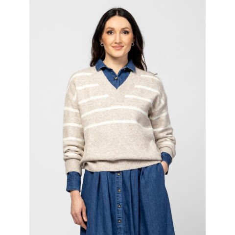 Női kötött pulóver, bővebb szabással, v-nyakkal, trendi csíkozással, kis fém márkajelzéssel az eleje alján. Anyaga: 98% poliészter, 2% elasztán, kötött anyag. A modell 175 cm magas és S-es méretet visel. T53030W2503