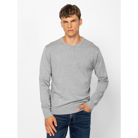 Férfi finom kötött pulóver klasszikus szabással, kerek nyakkal, kis szövött márkajelzéssel az oldalában, bordás kötött nyakkal, kézelővel és aljjal. Anyaga: 83% viszkóz, 17% nylon, kötött anyag. A modell 188 cm magas és L-es méretet visel. T52039W2503