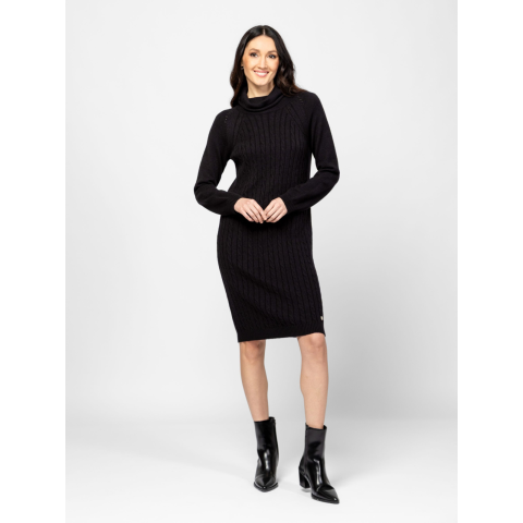 Női kötött ruha, nőies vonalvezetéssel, elején csavart mintával, térdig érő hosszal, raglán ujjal, garbó nyakkal, kis fém márkajelzéssel az alján. Anyaga: 49% viszkóz, 28% poliészter, 23% nylon, kötött anyag. A modell 175 cm magas és S-es méretet visel. T54012W2502
