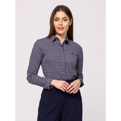 Heavy Tools Női Ing-blúz Ritas25 T40020S2502. Színe: rhombus Női ingblúz karcsúsított szabással, dekoratív gallér megoldással, gombos kézelővel, sikkes mintákkal, hímzett márkajelzéssel az ujja hasítéknál, elasztánnal kevert pamut anyagból. Anyaga: 97% pamut, 3% elasztán, puplin. A modell 175 cm magas és S-es méretet visel. T40020S2502