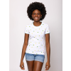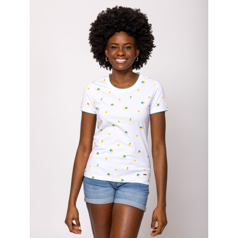 Heavy Tools Női Póló Metera T17020S2501. Színe: lemon  Női rövid ujjú póló enyhén karcsúsított szabással, kerek nyakkivágással, nyári hangulatot idéző mintákkal, alján kis fém márkajelzéssel, tiszta pamut anyagból. Anyaga: 100% pamut, single jersey. A modell 175 cm magas és S-es méretet visel.  T17020S2501