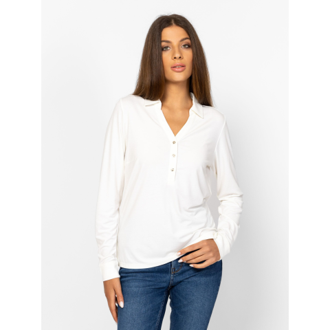 Női blúz, egyenes szabással, galléros-gombos v-nyakkal, gombos kézelővel, könnyen kezelhető elasztikus anyagból, alap színekben, kis fém márkajelzéssel az eleje alján. Anyaga: 60% viszkóz, 35% nylon, 5% elasztán. A modell 175 cm magas és S-es méretet visel.  T40032W2503
