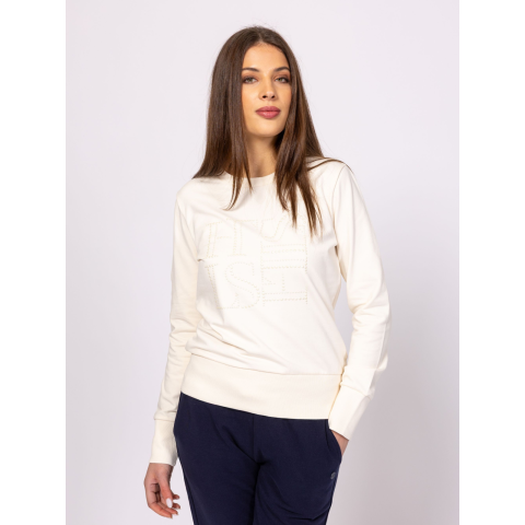 Heavy Tools Női Pulóver Dambia T02012S2501. Színe: ivory Női kerek nyakú pulóver, bordás passzés aljjal és kézelővel, elején kövekből kirakott márkajelzéssel. Anyaga: 95% pamut, 5% elasztán, french terry. A modell 175 cm magas és S-es méretet visel. T02012S2501