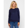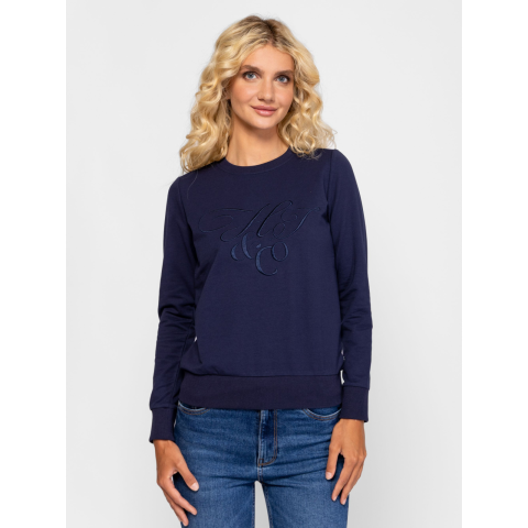Női pulóver, klasszikus vonalvezetéssel, kerek nyakkal, bordás passzés aljjal és kézelővel, magas pamut tartalmú anyagból, elején hímzett márkajelzéssel, hátán kis fém márkajelzéssel. Anyaga: 58% pamut, 38% poliészter, 4% elasztán, belül enyhén bolyhozott fleece. A modell 175 cm magas és S-es méretet visel. T02019W2503
