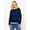 Női kötött pulóver, klasszikus szabással, kerek nyakkal, csavart kötésmintával, kis szövött márkajelzéssel az elején. Anyaga: 55% akril, 45% pamut, kötött anyag. A modell 175 cm magas és S-es méretet visel. T53024W2505