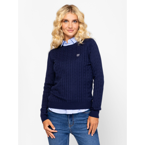 Női kötött pulóver, klasszikus szabással, kerek nyakkal, csavart kötésmintával, kis szövött márkajelzéssel az elején. Anyaga: 55% akril, 45% pamut, kötött anyag. A modell 175 cm magas és S-es méretet visel. T53024W2505