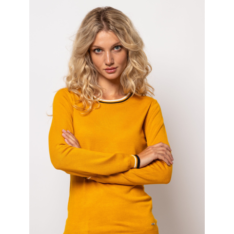 Heavy Tools Női Pulóver Hantaw23 F6W23007CU. Színe: curry A legegyszerűbb hétköznapi szettet is pillanatok alatt egyedivé varázsolja ez a női finom kötött pulóver, mellyel még irodai megjelenésedet is feldobhatod! Nyaka és kézelője dekoratív csíkos passzéban végződik. Könnyű, puha tapintású magas viszkóztartalmú anyagból készült, elején apró fém márkajelzéssel. Anyaga: 75% viszkóz, 25% nylon, kötött. A modell 175 cm m