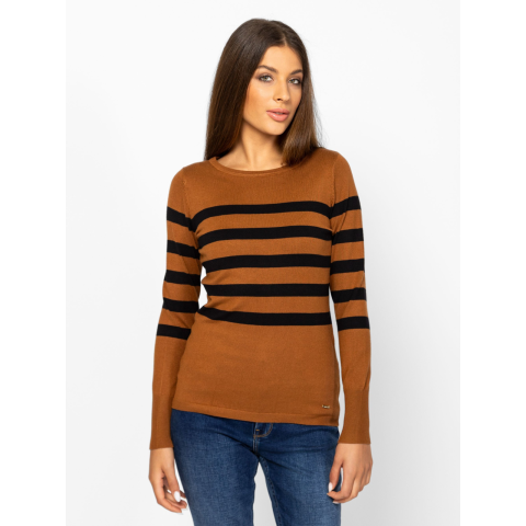 Heavy Tools Női Pulóver Hora T53040W2501. Színe: caramel Női finom kötött pulóver izgalmas csíkozással, kerek nyakkal, kis fém márkajelzéssel az eleje alján. Anyaga: 75% viszkóz, 25% nylon, kötött anyag. A modell 175 cm magas és S-es méretet visel. T53040W2501