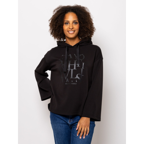 Heavy Tools Női Pulóver Saneli T04006W2401. Színe: black Női bebújós, kapucnis pulóver, bővebb szabással, ejtett vállal, logózott, húzózsinórral állítható kapucnival, nagy nyomott dekorációval és márkajelzéssel az elején. Viseld hozzá ZELLA24 vagy ZEDALLA24 nadrágunkat. Anyaga: 50% modal, 44% poliészter, 6% elasztán. A modell 175 cm magas és S-es méretet visel. T04006W2401
