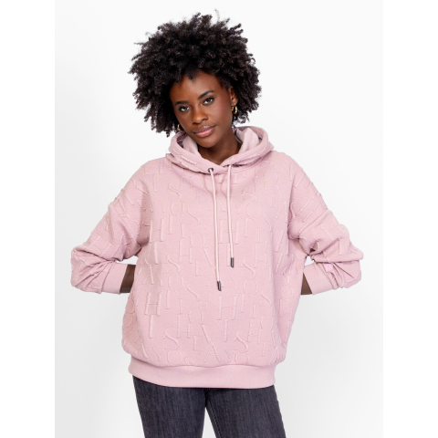 Női bebújós, kapucnis pulóver, bővebb szabással, ejtett vállal, bordás passzés aljjal és kézelővel, logó mintával, kis márkajelzéssel az ujja alján. Anyaga: 97% poliészter, 3% elasztán, jacquard kötésű anyag. A modell 175 cm magas és S-es méretet visel. T04028W2501