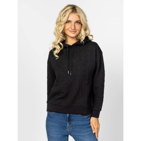 Női bebújós, kapucnis pulóver, bővebb szabással, ejtett vállal, bordás passzés aljjal és kézelővel, logó mintával, kis márkajelzéssel az ujja alján. Anyaga: 97% poliészter, 3% elasztán, jacquard kötésű anyag. A modell 175 cm magas és S-es méretet visel. T04028W2503