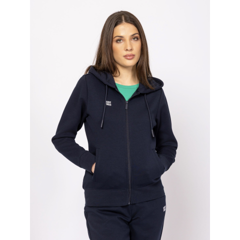 Heavy Tools Női Pulóver Saula T04019S2502. Színe: navy Női cipzáras, kapucnis pulóver, testhez álló fazonnal, bordás passzés aljjal és kézelővel, egyenes zsebekkel, magas pamut tartalmú anyagból, kis márkajelzéssel az elején és az oldalában. Anyaga: 72% pamut, 28% poliészter. A modell 175 cm magas és S-es méretet visel.FTC kollekcioról bővebben. T04019S2502