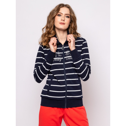 Ez a női cipzáras, állógalléros pulóver igazi klasszikus! Nőies vonalvezetésével, passzés ujja aljával és csípőrészével, egyenes zsebével, klasszikus csíkozásával és nagy, nyomott márkajeltésével egész szezonban viselheted. Magas pamut tartalmával igazán kényelmes darab a mozgalmasabb időszakokban is. Nagyszerű választás aktív programokhoz. Válaszd hozzá ZIARA nadrágunkat az új kollekcióból! Anyaga: 57% pamut, 43% poliészter, french terry. A modell 175 cm