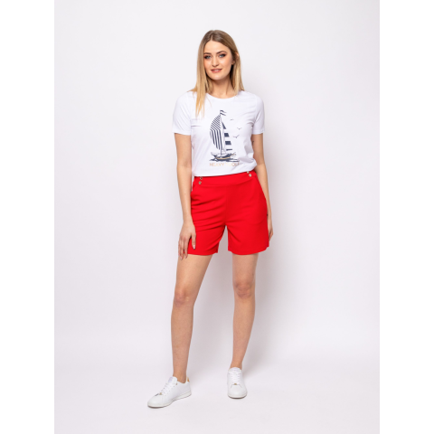Ez a női, bőszárú rövid nadrág ragyogó színeivel, kényelmes, lefelé bővülő szárával, gumírozott derékrészével, oldalzsebeivel és kis logózott fém gombjaival nagyszerű választás egy sikkes hétköznapi, rohanós összeállításhoz, de egy nyár esti partira is ideális. A könnyű, jól szellőző anyag kiemelkedő kényelmet és mozgásszabadságot biztosít viselőjének. Anyaga: 95% poliészter, 5% elasztán. A modell 175 cm magas és S-es méretet visel. E6S24676RE