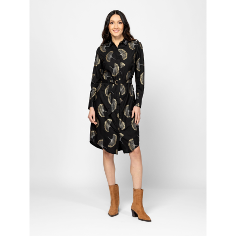 Női ingruha, egyenes szabással, térd alatti hosszal, dekoratív gallér megoldással, rejtett gombolással, övvel állítható derékkal, izgalmas mintákkal, könnyen kezelhető anyagból, kis fém márkajelzéssel a hátán. Anyaga: 100% viszkóz. A modell 175 cm magas és S-es méretet visel. T50037W2502