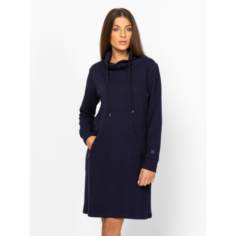 Női ruha, kényelmes, enyhén karcsúsított szabással, geometrikus mintával, cipzáros zsebekkel, magasított, húzózsinóros nyakkal, kis márkajelzéssel az ujja alján. Magas pamuttartalmú, könnyen kezelhető anyagból. Anyaga: 50% pamut, 50% poliészter. A modell 175 cm magas és S-es méretet visel. T12023W2501