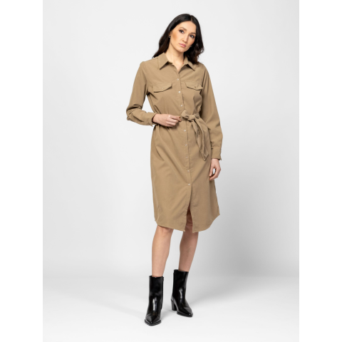 Női kordbársony ruha, klasszikus szabással, térd alatti hosszal, övvel állítható derékkal, eleje mell részen zsebfedővel, kis fém márkajelzéssel a hátán. Anyaga: 98% poliészter, 2% elasztán, microcord. A modell 175 cm magas és S-es méretet visel. T50041W2502