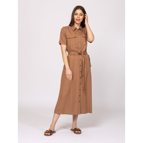Heavy Tools Női Ruha/overál Vedbi T50033S2501. Színe: latte Női rövid ujjú ingruha, stílusos megjelenéssel, dekoratív gallér megoldással, elöl zsebekkel, bő szoknyarésszel, övvel állítható derékkal. Anyaga: 100% viszkóz, twill. A modell 175 cm magas és S-es méretet visel. T50033S2501