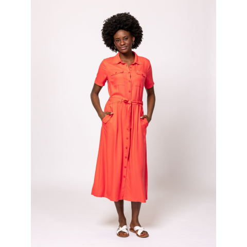 Heavy Tools Női Ruha/overál Vedbi T50033S2502. Színe: coral Női rövid ujjú ingruha, stílusos megjelenéssel, dekoratív gallér megoldással, elöl zsebekkel, bő szoknyarésszel, övvel állítható derékkal. Anyaga: 100% viszkóz, twill. A modell 175 cm magas és S-es méretet visel. T50033S2502