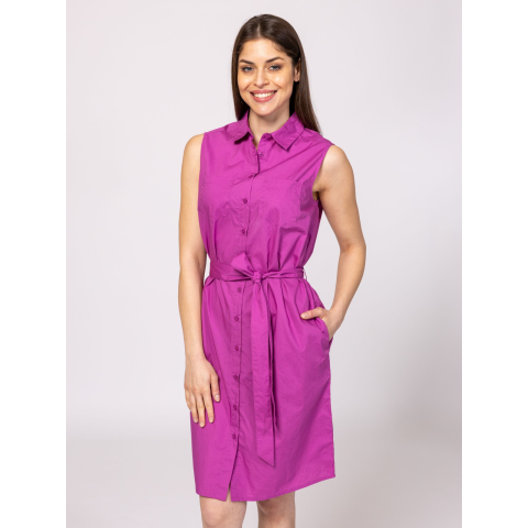 Heavy Tools Női Ruha/overál Velha T50027S2502. Színe: orchid Női ujjatlan ingruha, dekoratív gallér megoldással, elöl zsebekkel, térdig érő szabással, övvel állítható derékkal. Anyaga: 100% pamut poplin. A modell 175 cm magas és S-es méretet visel. T50027S2502