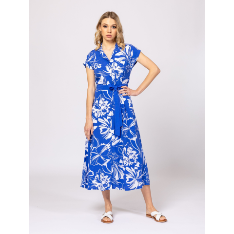 Heavy Tools Női Ruha/overál Vernica T50026S2501. Színe: FLORIS Női rövid ujjú ingruha, dekoratív gallér megoldással, hajtókás ujjal, hosszú szabással, bő szoknyarésszel, övvel állítható derékkal. Anyaga: 100% viszkóz. A modell 175 cm magas és S-es méretet visel. T50026S2501