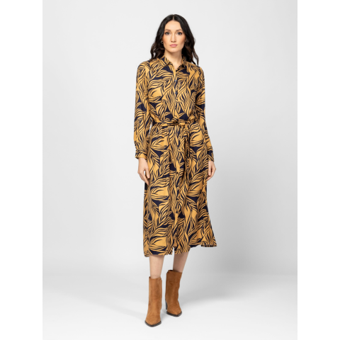 Női ingruha, nőies szabással, midi hosszal, gombos-galléros megoldással, övvel állítható derékkal, izgalmas mintákkal, könnyen kezelhető anyagból, kis fém márkajelzéssel a hátán. Anyaga: 100% viszkóz, twill. A modell 175 cm magas és S-es méretet visel. T50040W2502