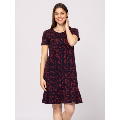Heavy Tools Női Ruha/overál Vimons25 T23005S2502. Színe: polka Női rövid ujjú nyári ruha, kerek nyakkal, térdig érő szabással, fodros szoknya résszel, vitorlás hangulatot idéző színekben és mintával, elasztikus pamut anyagból. Anyaga: 95% pamut, 5% elasztán, single jersey. A modell 175 cm magas és S-es méretet visel. T23005S2502