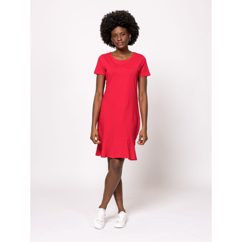 Heavy Tools Női Ruha/overál Vimons25 T23005S2503. Színe: CYCLAMEN Női rövid ujjú nyári ruha, kerek nyakkal, térdig érő szabással, fodros szoknya résszel, vitorlás hangulatot idéző színekben és mintával, elasztikus pamut anyagból. Anyaga: 95% pamut, 5% elasztán, single jersey. A modell 175 cm magas és S-es méretet visel. T23005S2503