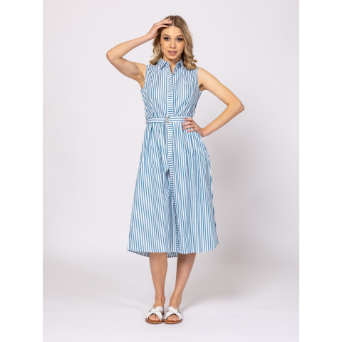 Heavy Tools Női Ruha/overál Virags25 T50030S2501. Színe: lines Női ujjatlan ingruha, dekoratív gallér megoldással, hosszú szabással, bő szoknyarésszel, övvel állítható derékkal, enyhén karcsúsított. Anyaga: 100% cotton poplin. A modell 175 cm magas és S-es méretet visel. T50030S2501
