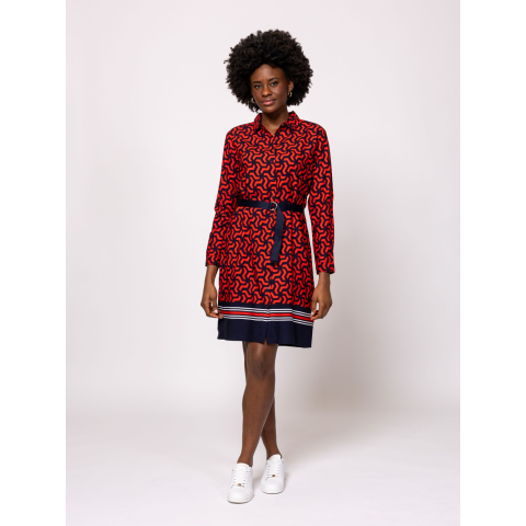 Heavy Tools Női Ruha/overál Vivions25 T50014S2503. Színe: geometric Női ingruha, egyenes szabással, térd feletti hosszal, dekoratív gallér megoldással, gombolással, övvel állítható derékkal, izgalmas mintákkal, könnyen kezelhető anyagból, kis fém márkajelzéssel a hátán. Anyaga: 100% viszkóz. A modell 175 cm magas és S-es méretet visel. T50014S2503