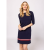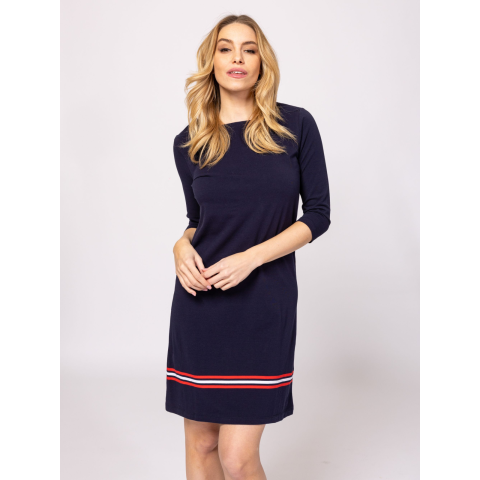 Heavy Tools Női Ruha/overál Vumba T23004S2502. Színe: navy Női ruha háromnegyedes ujjal, csónak nyakkal, térdig érő szabással, vitorlás hangulatot idéző színekben és mintával, elasztikus pamut anyagból. Anyaga: 95% pamut, 5% elasztán, single jersey. A modell 175 cm magas és S-es méretet visel. T23004S2502