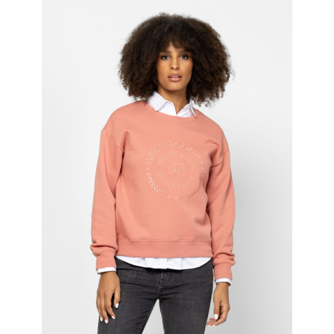 Női pulóver, kerek nyakkal, bővebb szabással, ejtett vállal, bordás passzés aljjal és kézelővel, magas pamut tartalmú anyagból, nagy hímzett márkajelzéssel az elején, szövött címkével az oldalában. Anyaga: 80% pamut, 20% poliészter, belül bolyhozott fleece. A modell 175 cm magas és S-es méretet visel. T02018W2503