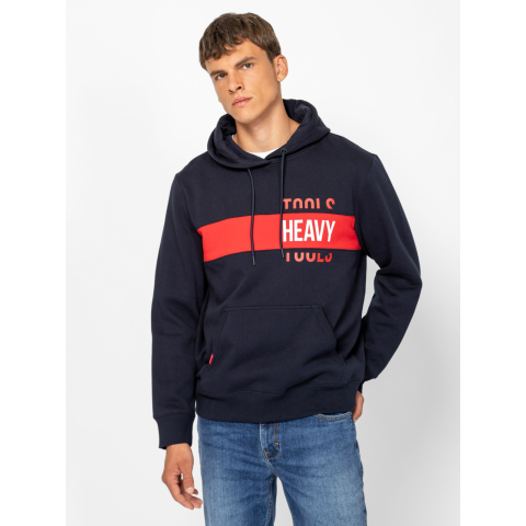Férfi bebújós, kapucnis pulóver, sportos szabással, kenguruzsebbel, bordás passzés kézelővel és aljjal, nyomott márkajelzéssel az elején, zsebén szövött címkével. Anyaga: 80% pamut, 20% poliészter, belül bolyhozott fleece. A modell 188 cm magas és L-es méretet visel. T03039W2501