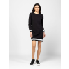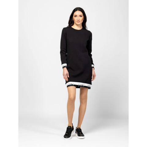 Női kerek nyakú ruha, egyenes szabással, térd feletti hosszal, bordás passzés aljjal és kézelővel, alja és kézelő passzén lurexes logóval, ujján kis fém márkajelzéssel. Anyaga: 73% pamut, 23% poliészter, 4% elasztán, jersey. A modell 175 cm magas és S-es méretet visel. T12016W2502