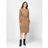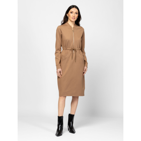 Női ruha, kényelmes, enyhén karcsúsított szabással, elején cipzárral, álló gallérral, húzózsinorral állítható derékkal, szabásvonalba helyezett zsebekkel, elasztikus anyagból, kis fém márkajelzéssel a hátán. Anyaga: 67% viszkóz, 28% nylon, 5% elasztán, twill. A modell 175 cm magas és S-es méretet visel. T12022W2501