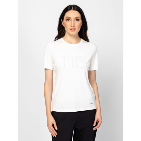 Női rövid ujjú póló, enyhén karcsúsított szabással, kerek nyakkal, elején hímzett, flitteres márkajelzéssel, eleje alján kis fém márkajelzéssel, elasztikus anyagból. Anyaga: 60% viszkóz, 35% nylon, 5% elasztán, jersey. A modell 175 cm magas és S-es méretet visel.  T17064W2502