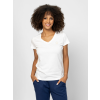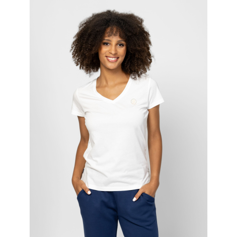 Női rövid ujjú póló, enyhén karcsúsított szabással, v-nyakkal, modállal kevert pamut anyagból, elején kis, nyomott és kövekből kirakott márkajelzéssel, oldalában szövött címkével. Anyaga: 50% pamut, 50% modal, single jersey. A modell 175 cm magas és S-es méretet visel.  T17057W2503