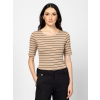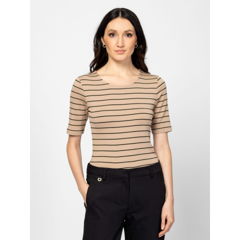 Női rövid ujjú póló, enyhén karcsúsított szabással, kerek nyakkal, csíkozásba beleszövött lurex szállal, elasztánnal és modállal kevert pamut anyagból, hátán és oldalában márkajelzéssel. Anyaga: 57% pamut, 38% modál, 3% elasztán, 2% fémszál. A modell 175 cm magas és S-es méretet visel.  T17066W2501