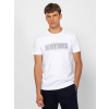Férfi rövid ujjú póló, egyenes szabással, kerek nyakkal, elején nagy nyomott márkajelzéssel, oldalában szövött címkével. Anyaga: 100% pamut, single jersey. A modell 188 cm magas és L-es méretet visel. T16106W2501