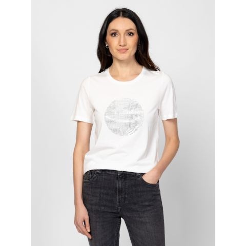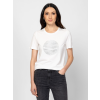 Női rövid ujjú póló egyenes szabással, kerek nyakkivágással, elején kövekből kirakott dekorációval, hátán kis fém márkajelzéssel. Anyaga: 50% pamut, 50% modal, single jersey. A modell 175 cm magas és S-es méretet visel.  T17060W2502