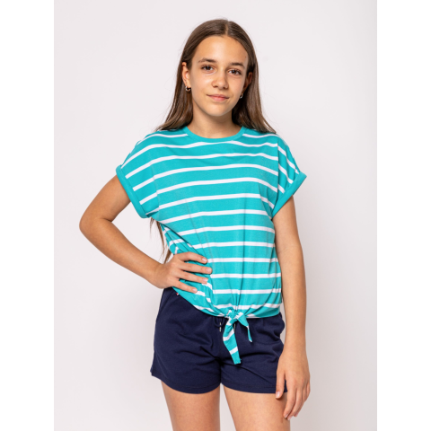 Heavy Tools Rövid Ujjú Póló Póló Morea T75002S2501. Színe: COOLTEAL Lányka rövid ujjú póló kényelmes, bővebb szabással, ejtett vállal, kerek nyakkivágással, megköthető aljjal, trendi csíkozással, oldalában szövött márkajelzéssel. Anyaga: 50% pamut, 50% modal, single jersey. T75002S2501