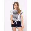 Heavy Tools Rövid Ujjú Póló Póló Morea T75002S2502. Színe: marine Lányka rövid ujjú póló kényelmes, bővebb szabással, ejtett vállal, kerek nyakkivágással, megköthető aljjal, trendi csíkozással, oldalában szövött márkajelzéssel. Anyaga: 50% pamut, 50% modal, single jersey. T75002S2502