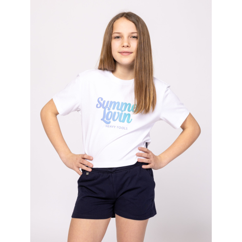 Heavy Tools Rövid Ujjú Póló Póló Myrta T75004S2501. Színe: white Lányka rövid ujjú póló, tiszta pamut anyagból, bővebb és rövidebb szabással, kerek nyakkivágással, elején színes, nyomott dekorávióval és márkajelzéssel. Anyaga: 100% pamut, single jersey. T75004S2501